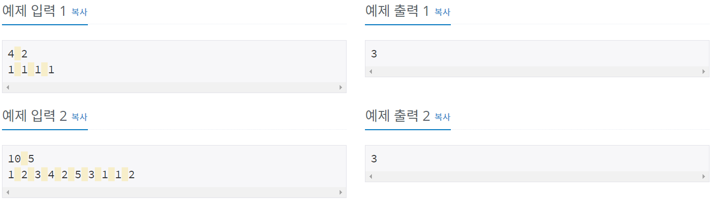 첫째 줄에 N(1 ≤ N ≤ 10,000), M(1 ≤ M ≤ 300,000,000)이 주어진다. 다음 줄에는 A[1], A[2], …, A[N]이 공백으로 분리되어 주어진다. 각각의 A[x]는 30,000을 넘지 않는 자연수이다.