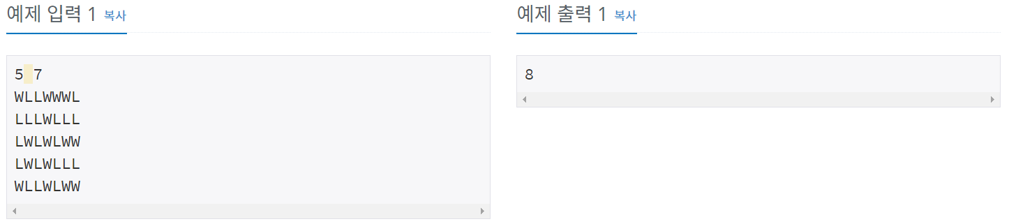 보물섬 지도를 발견한 후크 선장은 보물을 찾아나섰다. 보물섬 지도는 아래 그림과 같이 직사각형 모양이며 여러 칸으로 나뉘어져 있다. 각 칸은 육지(L)나 바다(W)로 표시되어 있다. 이 지도에서 이동은 상하좌우로 이웃한 육지로만 가능하며, 한 칸 이동하는데 한 시간이 걸린다. 보물은 서로 간에 최단 거리로 이동하는데 있어 가장 긴 시간이 걸리는 육지 두 곳에 나뉘어 묻혀있다. 육지를 나타내는 두 곳 사이를 최단 거리로 이동하려면 같은 곳을 두 번 이상 지나가거나, 멀리 돌아가서는 안 된다.
