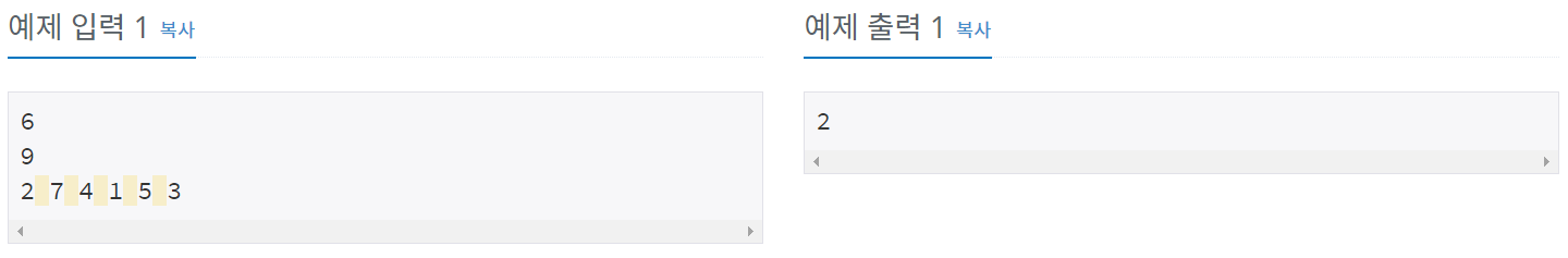 첫째 줄에는 재료의 개수 N(1 ≤ N ≤ 15,000)이 주어진다. 그리고 두 번째 줄에는 갑옷을 만드는데 필요한 수 M(1 ≤ M ≤ 10,000,000) 주어진다. 그리고 마지막으로 셋째 줄에는 N개의 재료들이 가진 고