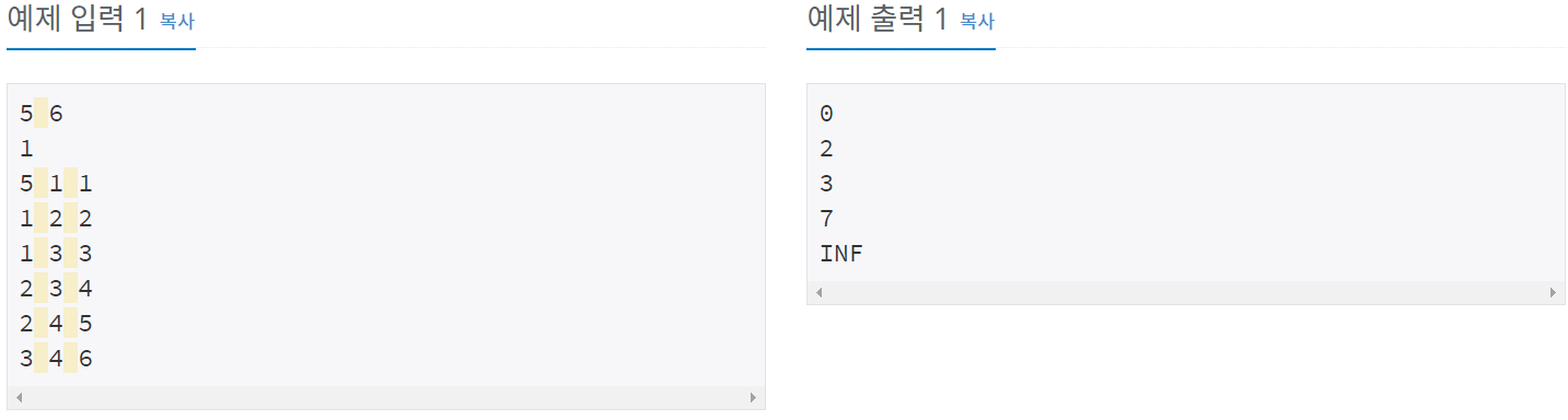 이후에 i번째 최단경로가 무한으로 초기화되어있다면 INF를 출력하고, 아니면 최단경로를 출력한다.