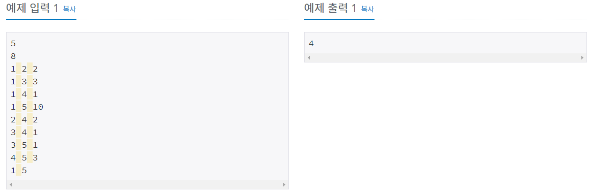 그리고 M+3째 줄에는 우리가 구하고자 하는 구간 출발점의 도시번호와 도착점의 도시번호가 주어진다. 출발점에서 도착점을 갈 수 있는 경우만 입력으로 주어진다.