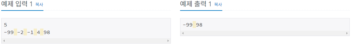 첫째 줄에 특성값이 0에 가장 가까운 용액을 만들어내는 두 용액의 특성값을 출력한다. 출력해야 하는 두 용액은 특성값의 오름차순으로 출력한다. 특성값이 0에 가장 가까운 용액을 만들어내는 경우가 두 개 이상일 경우에는 그 중 아무것이나 하나를 출력한다.