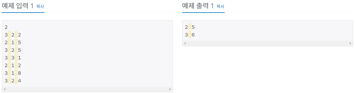 첫째 줄에 테스트 케이스의 개수가 주어진다. 테스트 케이스의 개수는 최대 100개이다. 각 테스트 케이스는 다음과 같이 이루어져 있다.
