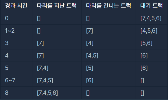 트럭 여러 대가 강을 가로지르는 일 차선 다리를 정해진 순으로 건너려 합니다. 모든 트럭이 다리를 건너려면 최소 몇 초가 걸리는지 알아내야 합니다. 트럭은 1초에 1만큼 움직이며, 다리 길이��