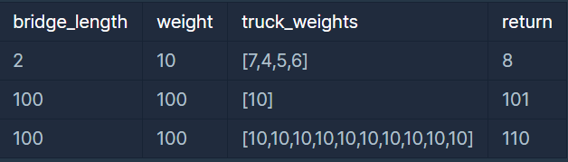 - bridge_length는 1 이상 10,000 이하입니다.