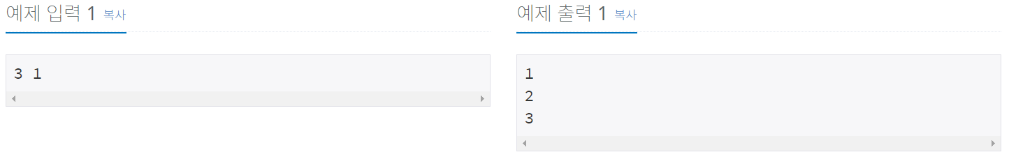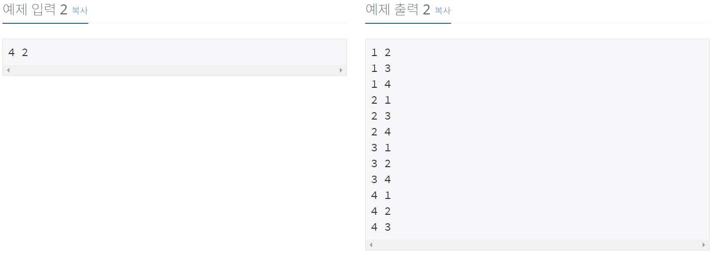 첫째 줄에 자연수 N과 M이 주어진다. (1 ≤ M ≤ N ≤ 8)