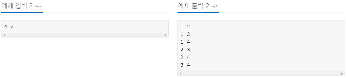 첫째 줄에 자연수 N과 M이 주어진다. (1 ≤ M ≤ N ≤ 8)