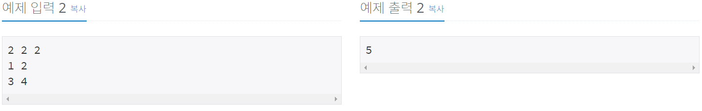 첫째 줄에 N, M, K가 주어진다. 둘째 줄부터 N개의 줄에 격자판에 들어있는 수가 주어진다.