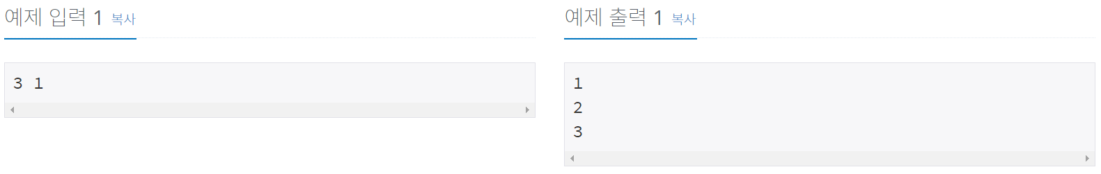 첫째 줄에 자연수 N과 M이 주어진다. (1 ≤ M ≤ N ≤ 7)