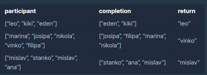마라톤에 참여한 선수들의 이름이 담긴 배열 participant와 완주한 선수들의 이름이 담긴 배열 completion이 주어질 때, 완주하지 못한 선수의 이름을 return 하도록 solution 함수를 작성해주세요.