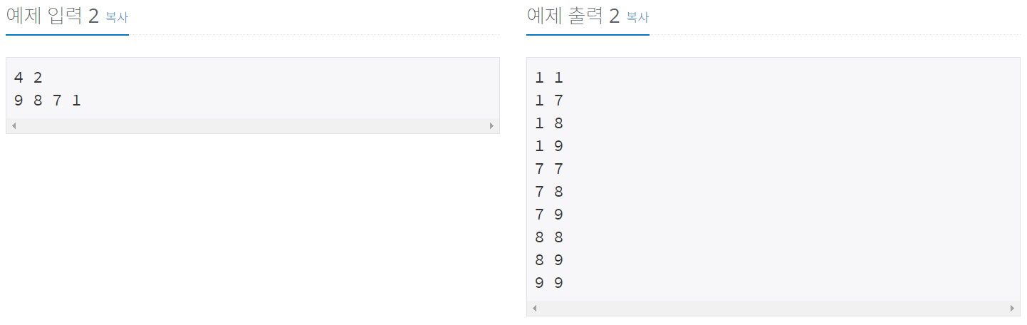 첫째 줄에 N과 M이 주어진다. (1 ≤ M ≤ N ≤ 8)