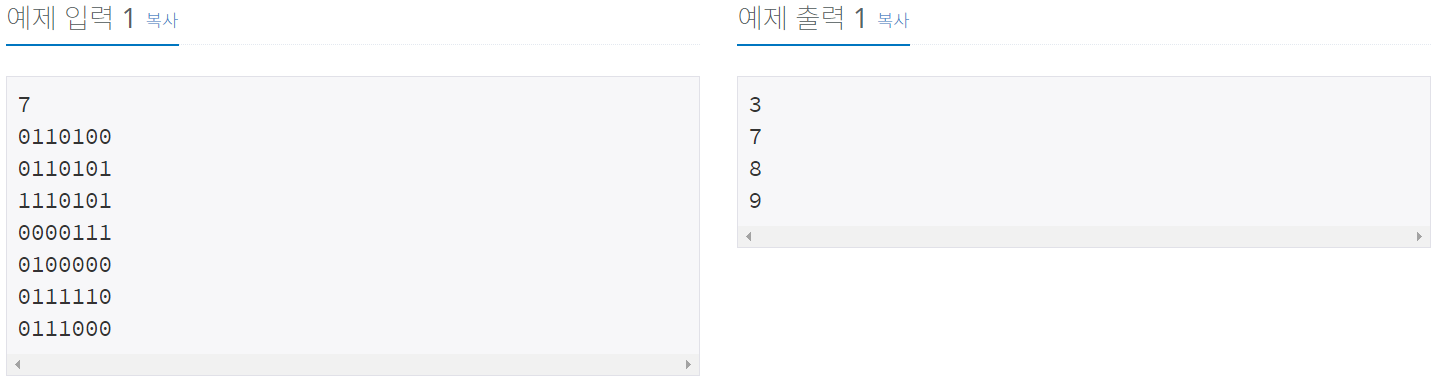 <그림 1>과 같이 정사각형 모양의 지도가 있다. 1은 집이 있는 곳을, 0은 집이 없는 곳을 나타낸다. 철수는 이 지도를 가지고 연결된 집들의 모임인 단지를 정의하고, 단지에 번호를 붙이려 한다. 여기서 연결되었다는 것은 어떤 집이 좌우, 혹은 아래위로 다른 집이 있는 경우를 말한다. 대각선상에 집이 있는 경우는 연결된 것이 아니다. <그림 2>는 <그림 1>을 단지별로 번호를 붙인 것이다. 지도를 입력하여 단지수를 출력하고, 각 단지에 속하는 집의 수를 오름차순으로 정렬하여 출력하는 프로그램을 작성하시오.