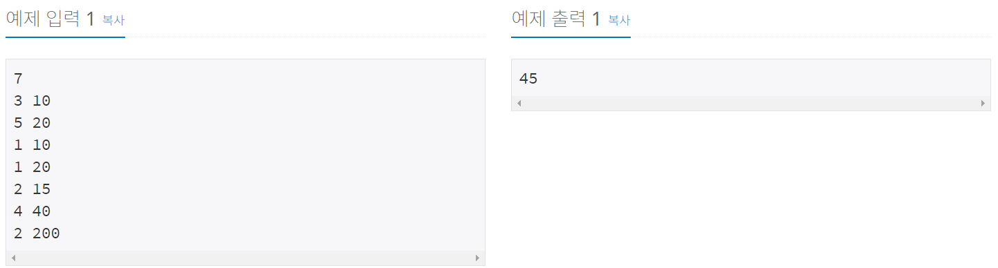 둘째 줄부터 N개의 줄에 Ti와 Pi가 공백으로 구분되어서 주어지며, 1일부터 N일까지 순서대로 주어진다. (1 ≤ Ti ≤ 5, 1 ≤ Pi ≤ 1,000)