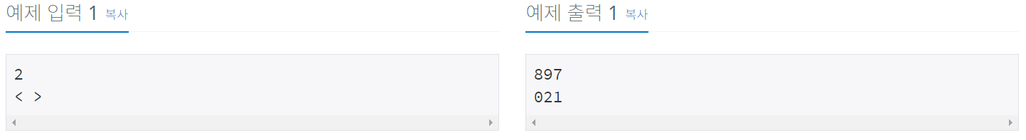 여러분은 제시된 부등호 관계를 만족하는 k+1 자리의 최대, 최소 정수를 첫째 줄과 둘째 줄에 각각 출력해야 한다. 단 아래 예(1)과 같이 첫 자리가 0인 경우도 정수에 포함되어야 한다. 모든 입력에 답은 항상 존재하며 출력 정수는 하나의 문자열이 되도록 해야 한다.