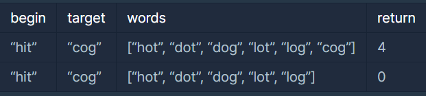 예를 들어 begin이 hit, target가 cog, words가 [hot,dot,dog,lot,log,cog]라면 hit -> hot -> dot -> dog -> cog와 같이 4단계를 거쳐 변환할 수 있습니다.