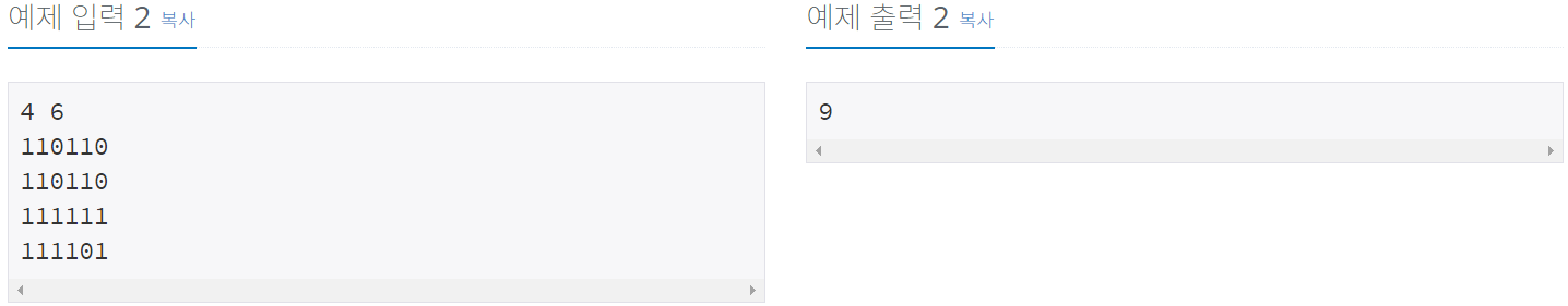 첫째 줄에 두 정수 N, M(2 ≤ N, M ≤ 100)이 주어진다. 다음 N개의 줄에는 M개의 정수로 미로가 주어진다. 각각의 수들은 붙어서 입력으로 주어진다.