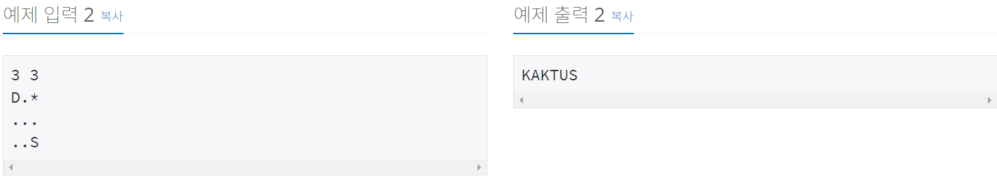 첫째 줄에 고슴도치가 비버의 굴로 이동할 수 있는 가장 빠른 시간을 출력한다. 만약, 안전하게 비버의 굴로 이동할 수 없다면, "KAKTUS"를 출력한다.